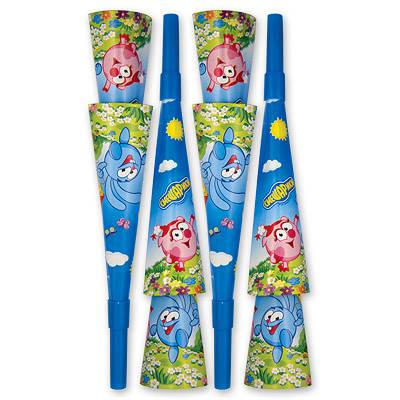 Игрушка-свистулька Горн Смешарики 8шт., при вдувании воздуха разворачивается и издает звук, рекомендуется использовать в комплекте с другими атрибутами праздника.
