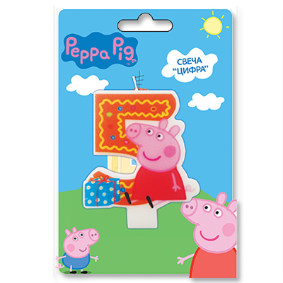 Свеча -цифра "5" Пеппа 8см. отличное оформление торжественного торта. Прекрасно сочетается с воздушными шарами похожих расцветок.