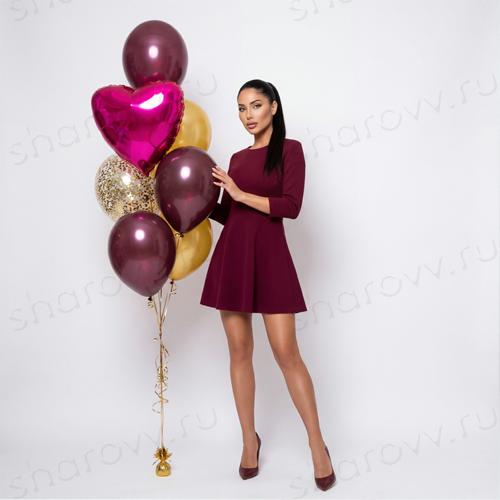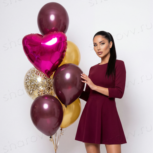 Букет из воздушных шаров состоит из 6 латексных (3 зеркальных шара бургундия, 2 металлик золото и 1 конфетти золото) и 1 фольгированного сердца фуксия. Размер латексных шаров 35-40см., гарантированное время полета шариков 48 часов (как правило летают неделю и дольше). Шарики доставляются собранные в букет на грузе.