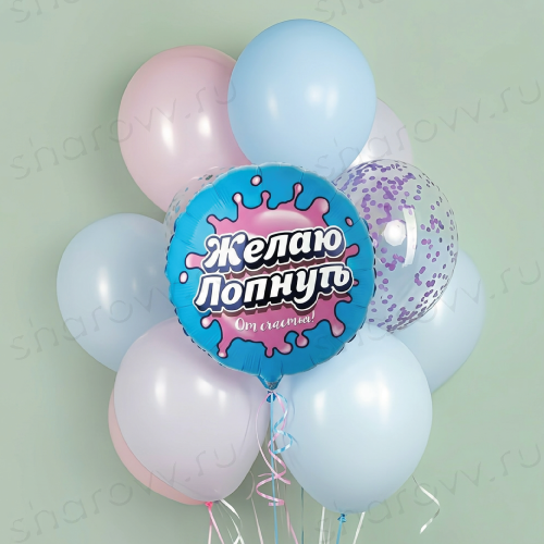 Размер латексных шаров 35-40см. Гарантированное время полета шариков 48 часов (как правило летают неделю и дольше). Шарики доставляются собранные в букет на грузике.