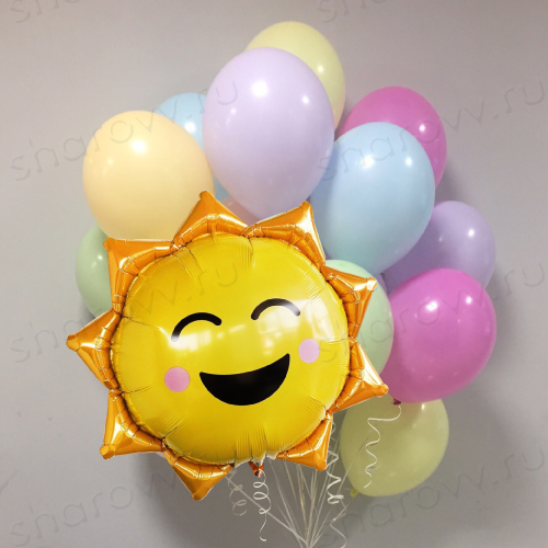 Букет из шаров "Лучезарный" состоит из 15 латексных шаров макарунс и фольгированной фигуры в виде улыбающегося солнца. Размер латексных шаров 35-40см. Гарантированное время полета шариков 48 часов (как правило летают неделю и дольше). Шарики доставляются собранными в букет, который можно распустить под потолок.