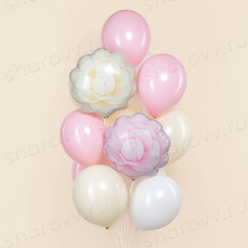 Фонтан из шаров "Нежность камелии" состоит из 11 латексных (по 4 розовых и айвори и 3 белых) и 2 фольгированных шариков в виде разных цветков камелии.