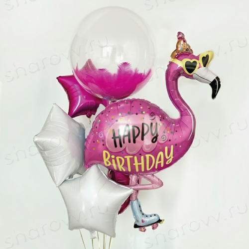 - фольгированной фигуры в виде стильного фламинго с надписью ко Дню рождения;