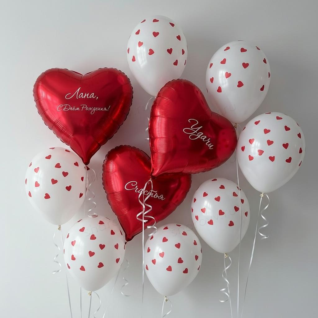 Облако из шаров ассорти "Каскад чувственности" состоит из 7 шаров даблстафф и 3 фольгированных красных сердец с индивидуальной надписью на каждом сердце.