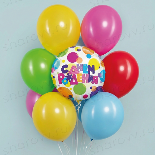 Облако из шаров ассорти "Воздушное монпансье" состоит из 9 латексных шаров ассорти пастель и фольгированного шара круга с готовым дизайном на День рождения. Размер латексных шаров 35-40см. Гарантированное время полета шариков 48 часов (как правило летают неделю и дольше). Шарики доставляются собранные в букет, который можно распустить под потолок. Если необходимо собрать шары в фонтан, сообщите об этом при оформлении заказа в комментарии к заказу или по телефону менеджеру.