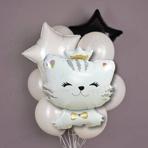Облако из шаров "Милому котёнку" состоит из 7 латексных шаров белого цвета и 3 фольгированных шариков: 2 фольгированные звезды и шар-фигура в виде милого котёнка. Размер латексных шаров 35-40см. Гарантированное время полета шариков 48 часов (как правило летают неделю и дольше). Шарики доставляются собранными в букет, который можно распустить. Если необходимо оформить облако в фонтан, сообщите об этом в комментарии при оформлении заказа или по телефону менеджеру.