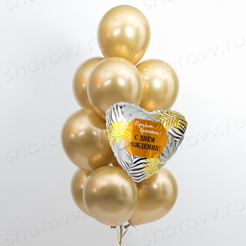 Фонтан из шаров "Эффектный" состоит из 9 латексных шаров хром золотых и 1 фольгированного шара сердца с надписью: "Привет, красотка! С Днём рождения!". Размер латексных шаров 30-35 см, время полета 12 часов. Гарантированное время полета обработанных шариков 48 часов (как правило летают неделю и дольше). Шарики доставляются собранными в фонтан на грузике.