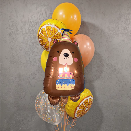 Фонтан из шаров "Торт с апельсином" состоит из 5 латексных шариков (1 с конфетти и 4 латексных без рисунка: два жёлтых, 2 оранжевых разных оттенков) и 3- фольгированных шариков (2 апельсина и медвежонок с тортиком). Гарантированное время полета шариков 48 часов (как правило летают неделю и дольше). Шарики доставляются собранные в фонтан на грузике.