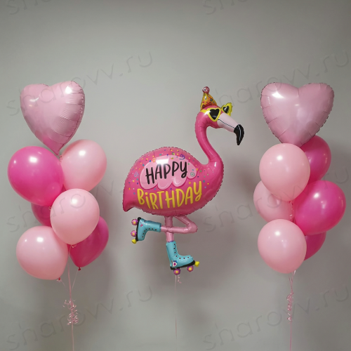 Композиция из шаров "Элафониси" состоит из фольгированной фигуры "Фламинго на стиле" и двух фонтанов шаров, в каждом из которых: