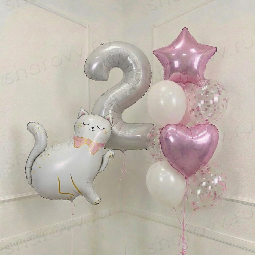 Композиция из шаров "Леди Кошечка" состоит из фольгированного шара цифры на грузике, фольгированной фигуры "Кошечка с лапкой" на грузике и фонтана шаров, в котором: