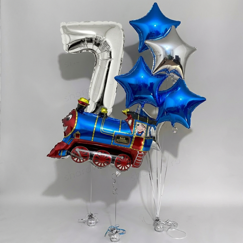 Композиция из шаров "Синий экспресс" состоит из фольгированной фигуры в виде поезда, фонтана шаров из пяти фольгированных звёзд (2 серебро и 3 синих металлик) и фольгированной цифры. Гарантированное время полета шариков 48 часов (как правило летают неделю и дольше). Шарики доставляются собранными в композицию на трёх разных грузиках.