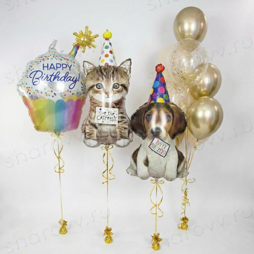 А также фольгированных фигурных шаров в виде щенка в колпаке, радужного кекса и котёнка в колпаке на трёх разных грузиках.