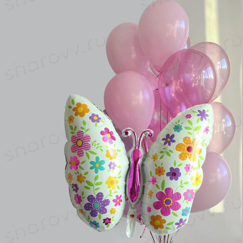 Набор шаров "Батерфляй" состоит из фольгированной фигуры бабочки на грузике и фонтана шаров, в котором: