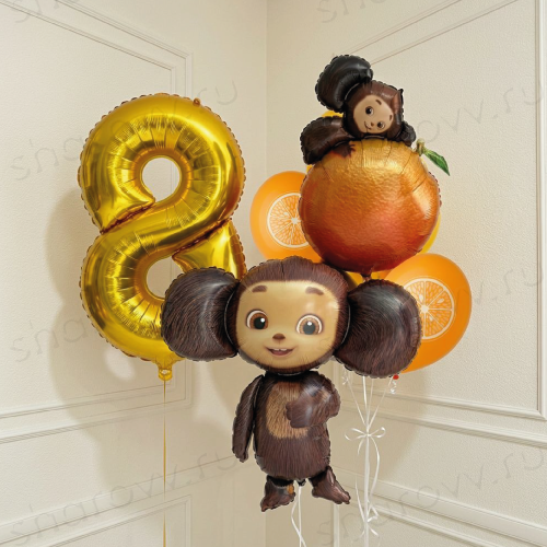 Сет из шаров "Апельсиновые чебурашки" состоит из фольгированной фигуры, фольгированной цифры на разных грузиках и фонтана шаров, в котором: