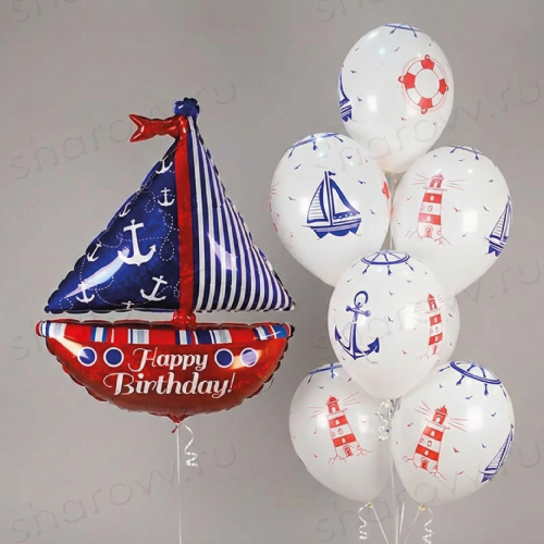 Сет из шаров "Морское приключение" состоит из фонтана шаров, в которм 7 шариков с готовым морским дизайном и фольгированной фигуры в виде парусника с надписью "Happy Birthday!" на отдельном грузике. Размер латексных шаров 35-40см. Гарантированное время полета шариков 48 часов (как правило летают неделю и дольше). Шарики доставляются собранные в сет на двух разных грузиках. Прекрасным дополнением к композиции может стать фольгированная цифра синего или серебряного цвета.
