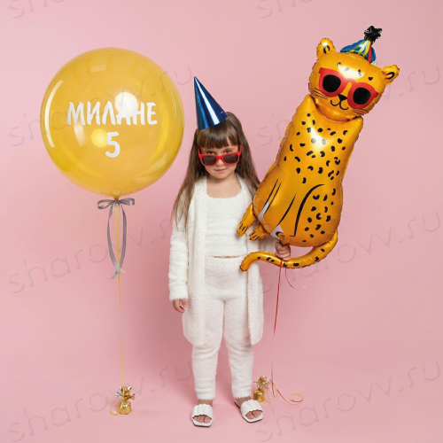 Сет из шаров "Симба" состоит из шара баблс даблстафф с индивидуальной надписью на выбор и фольгированной фигуры в виде леопарда на гузике. Гарантированное время полета шариков 48 часов (как правило летают неделю и дольше). Шарики доставляются сетом из большого шара даблстафф и фольгированной фигуры на разных грузиках. В шар можно добавить конфетти, изменить цвет надписи также можно написав в комментарии к заказу или по телефону менеджеру.