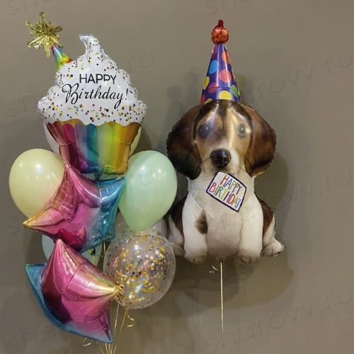 Сет из шаров "Сладкий маффин и щенок в колпаке" состоит из фольгированной фигуры щенка в колпаке на грузике и фонтана из 10 шаров ассорти: