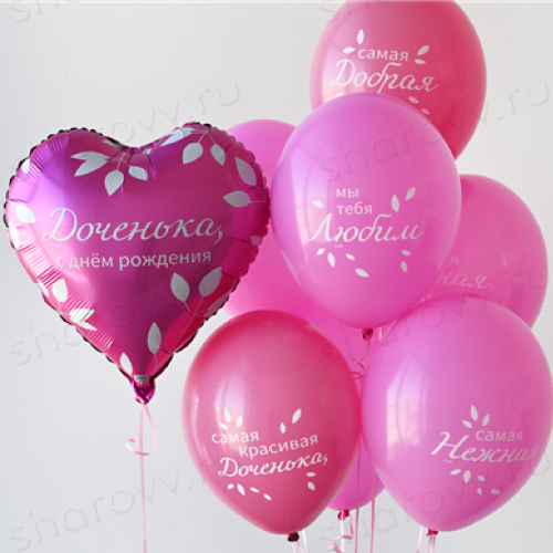 Сет из шаров "С ДР, доченька!" состоит из фонтана шаров, в котором 7 шариков ассорти с разными надписями и фольгированного шара в виде сердца с готовой надписью . Размер латексных шаров 35-40см. Гарантированное время полета шариков 48 часов (как правило летают неделю и дольше). Шарики доставляются собранными в сет из фонтана шаров и фольгированного шара на отдельном грузике. Если будет необходимо пустить шарики под потолок или добавить шаров, сообщите об этом в комментарии к заказу или по телефону менеджеру.