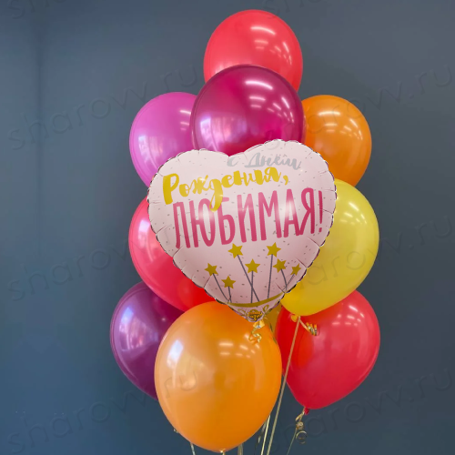 Фонтан из воздушных шаров "С Днём рождения, любимая!" состоит из 1 фольгированных шарика в виде сердца с готовой надписью и 9 латексных шаров: