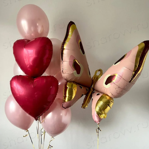 Сет из шаров "Поцелуй бабочки" состоит из фонтана шаров, в котором 7 шаров дабл-стафф (розовый+кристалл) и 2 фольгированных красных сердца и эффектной фигурой бабочки на отдельном грузике. Размер латексных шаров 35-40см. Гарантированное время полета шариков 48 часов (как правило летают неделю и дольше). Шарики доставляются собранными в сет из фонтана шаров и фольгированной фигуры на двух разных грузиках.