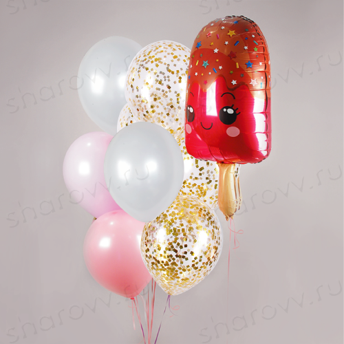 Сет из воздушных шаров "Вишневое эскимо" состоит из фонтана воздушных шариков, в котором 4 латексных (2 белых и 2 розовых шарика), 4 шариков с золотым конфетти и фольгированного шарика в виде мороженого на грузике. Гарантия на полёт от 48 часов. Шарики доставляем в надутом виде.