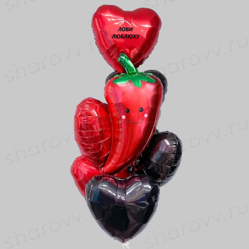 Фонтан из шаров "Пикантный привет" состоит из 6 фольгированных сердец по 3 красного и черного цвета, на одном их которых индивидуальная надпись и 1 фольгированной фигуры в виде красного перца-чили. Гарантированное время полета шариков от 2-х дней (как правило летают неделю и дольше). Шарики доставляются собранные в фонтан на грузике. Надпись на шарике на Ваш выбор, но можно как добавить надпись, так и убрать совсем. Сообщите об этом в комментарии при оформлении заказа или по телефону менеджеру для перерасчета стоимости.