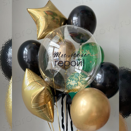 Композиция из шаров "Ты - только мой герой!" состоит из фонтана шаров, в котором 10 шаров: 2 фольгированные звезды золотого цвета, 4 латексных черных шара, 2 шарика оттенка камуфляж и 2 шара хром золотого оттенка, а также шар баблс с наполнением конфетти и индивидуальной надписью. Гарантированное время полета шариков 48 часов (как правило летают неделю и дольше). Шарики доставляются собранными в композицию из фонтана на грузике и шара баблс на отдельном грузике.