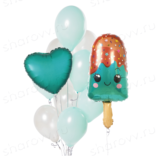 Сет из шаров "Эскимо Джейд" из фонтана шаров, в котором 9 латксных шариков макарунс и фольгированное сердце сатин и фольгированная фигура в виде мороженого эскимо. Размер латексных шаров 35-40см. Гарантированное время полета обработанных шариков 48 часов (как правило летают неделю и дольше). Шарики доставляются собранные в фонтан из шаров и фольгированной фигуры.