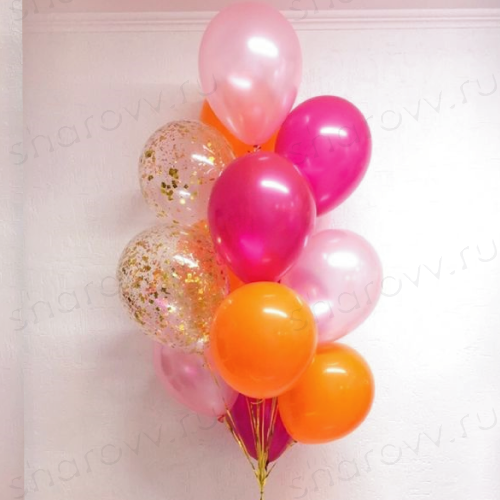 Фонтан из шаров "Апельсиновая долька" состоит из 12 латексных (2 с конфетти, 3 металлик розовых, 4 оранжевых и 3 цвета фуксии пастель). Размер латексных шаров 35-40см. Гарантированное время полета обработанных шариков 48 часов (как правило летают неделю и дольше). Шарики доставляются собранные в фонтан на грузике.