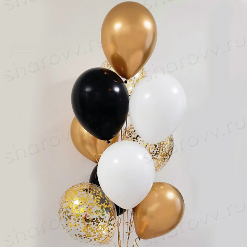 Фонтан из гелиевых шаров "Сникерс" состоит из 10 латексных шариков (3 с конфетти, 3 хром золотого цвета и по 2 черного и белого пастельного оттенка). Гарантированное время полета шариков 48 часов (как правило летают неделю и дольше). Шарики доставляются собранные в фонтан на грузике.