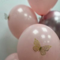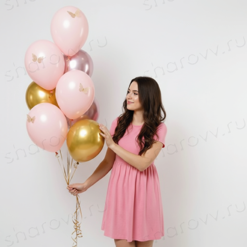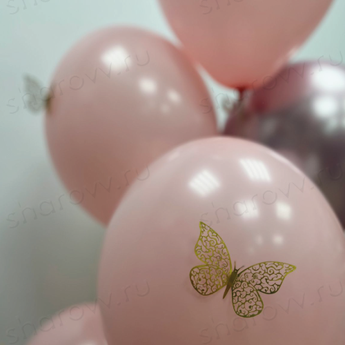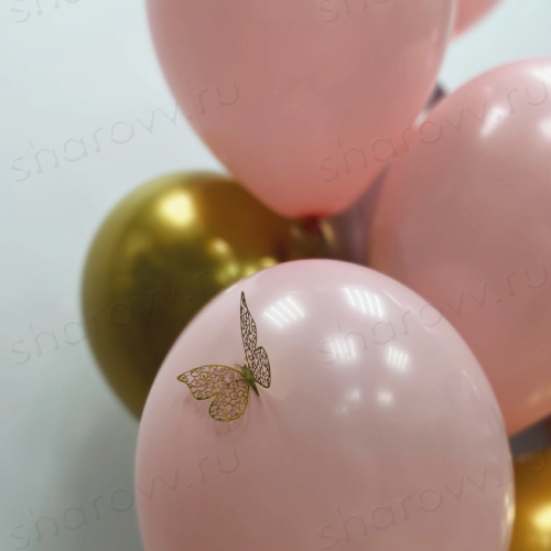 Фонтан из шаров "Трогательная невесомость" состоит из 8 латексных шаров (4 пастель розового и по 2 хром золотого и светло-розового оттенка). На пастельных шариках расположен декор в виде ажурных бабочек. Размер латексных шаров 35-40см. Гарантированное время полета шариков 48 часов (как правило летают неделю и дольше). Шарики доставляются собранными в фонтан на грузике.