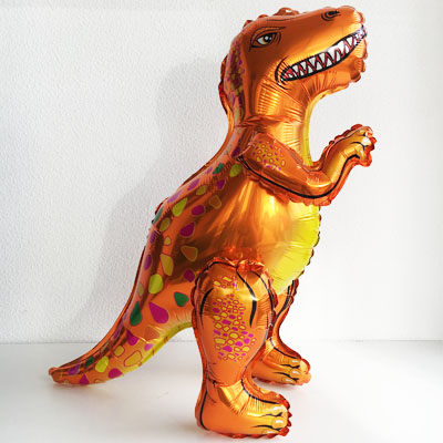 Ходячая фигура из фольги "Динозавр Тиранозавр оранжевый" заполнен гелием, к низу фигуры крепятся грузики которые не дают шарику взлетать, при этом он отлично стоит на полу. Время жизни ходячки от 3-х суток.