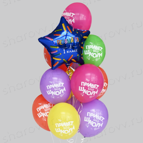 Фонтан из шаров "Первоклашке!" состоит из 12 латексных шаров ассорти с надписью и 1 фольгированной звезды с надписью "Первый раз в 1 класс!". Размер латексных шаров 35-40см. Гарантированное время полета шариков 48 часов (как правило летают неделю и дольше). Шарики доставляются собранными в фонтан на грузике на усмотрение аэродизайнера.