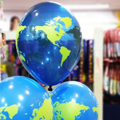 Воздушные шары в виде глобуса, наполнены гелием. Размер шариков 35-40см. Время полета 12 часов, можно продлить обработав шарики Hi-Float. Гарантированное время полета обработанных шариков 48 часов (как правило летают неделю и дольше).