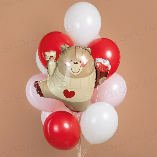 Фонтан из шаров "Послание мишки" состоит из 12 латексных шаров (по 4 пастель белого и красного цвета и 4 розовых макарунс) и фольгированной фигуры в виде мишки с букетом. Размер латексных шаров 35-40см. Гарантированное время полета шариков 48 часов (как правило летают неделю и дольше). Шарики доставляются собранными в фонтан на грузике.