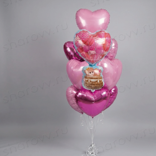 Фонтан из шаров "Романтичное путешествие" состоит из 8 фольгированных сердец (3 цвета фуксии и 5 розовых) и фольгированного воздушного шара с мишками. Гарантированное время полета шариков 48 часов (как правило летают неделю и дольше). Шарики доставляются собранными в фонтан на грузике.