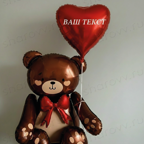 Композиция из шаров "Сердце в подарок" состоит из фольгированной фигуры в виде мишки, наполненного воздухом, к лапе которого привязано красное фольгированноое сердце с индивидуальной надписью. Гарантированное время полета шарика 48 часов (как правило летают неделю и дольше). Шарики доставляются собранные в композицию из фольгированной фигуры и фольгированного сердца. Чтобы отобразить на сердце желаемую надпись, укажите информацию об этом в комментарии к заказу или по телефону менеджеру.