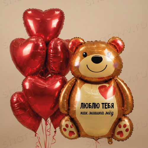 Композиция из шаров "Тайна мишки" состоит из фонтана шаров, в котором 7 фольгированных красных сердец и фольгированной фигуры в виде медвежонка с индивидуальной надписью. Гарантированное время полета шариков 48 часов (как правило летают неделю и дольше). Шарики доставляются собранные композицию из фонтана красных сердец и фольгированной фигуры на разных грузиках. Надпись на шаре можно убрать или изменить, если это необходимо, сделайте комментарий при оформлении заказа или по телефону менеджеру.