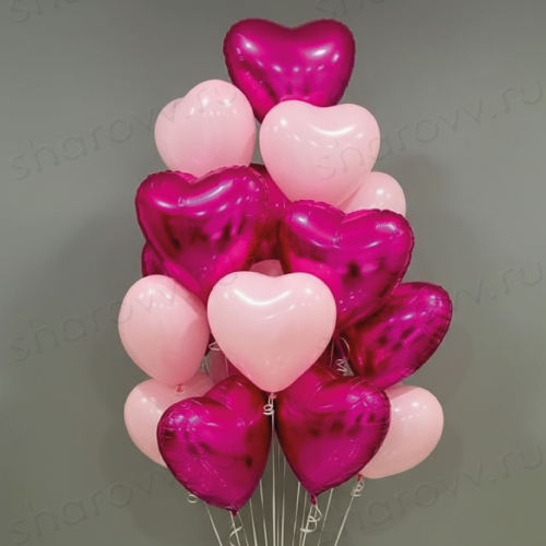 Облако из шаров "Розовое наслаждение" состоит из 7 фольгированных сердец цвета фуксии и 8 латексных сердец розового оттенка. Гарантированное время полета шариков 48 часов (как правило летают неделю и дольше). Шарики доставляются собранными в облако, которое можно распустить.