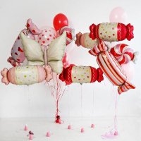 Воздушный шар из фольги "Конфета сердца розовые" надут гелием. Время полета фольгированного шара от 3-х дней до нескольких недель.