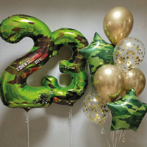 Сет из шаров "Погоны звёзд" состоит из двух фольгированных цифр с готовым дизайном на 23-февраля и фонтана шаров, в котором: