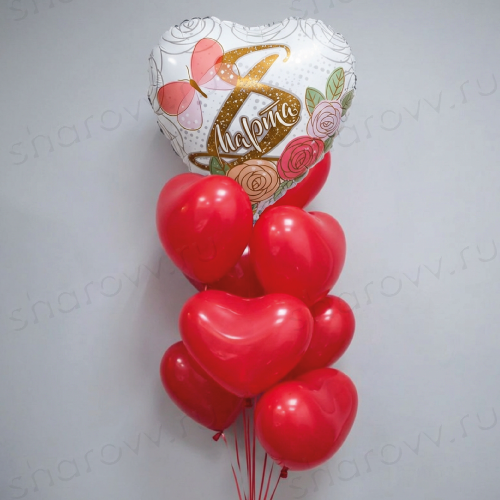 Фонтан из шаров "Букет нежных признаний" состоит из 9 латексных красных сердец и фольгированного шара сердца с готовым дизайном на 8-е марта. Гарантированное время полета шариков 48 часов (как правило летают неделю и дольше). Шарики доставляются собранные в фонтан на грузике.