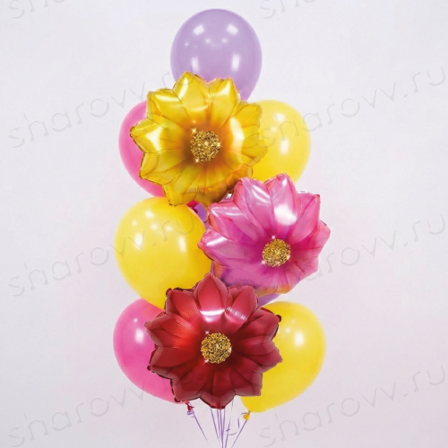 - 3 фольгированных шаров в виде разных цветов георгина;
