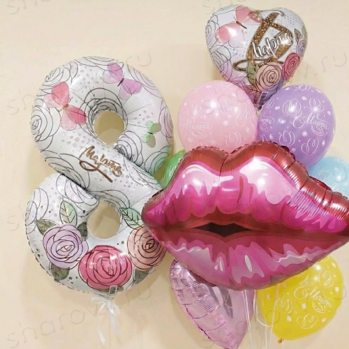 Сет из шаров "Праздник красоты" состоит из фольгированной цифры с готовым рисунком на праздник 8-е марта и фонтана шаров, в котором: