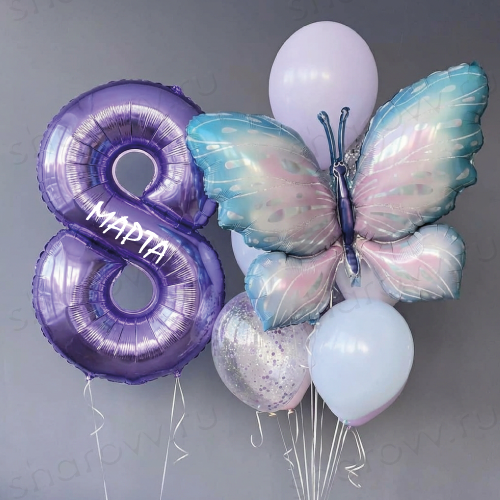 Сет из шаров "Весенний вернисаж" состоит из фольгированного шара цифры 8 с надписью и фонтана шаров, в котором: