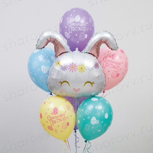 Букет из гелиевых шаров "Счастливой Пасхи" состоит из 6 латексных шаров ассорти с готовым дизайном и 1 фольгированного шарика в виде головы зайки. Размер латексных шаров 35-40см. Гарантированное время полета шариков 48 часов (как правило летают неделю и дольше). Шарики доставляются собранные в букет на грузике.