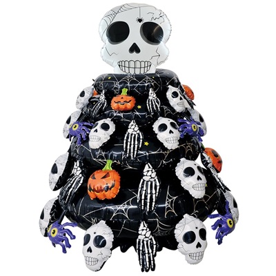 Шар из фольги "Череп сборный" надут воздухом и стоит на полу. Время сохранения формы фольгированного шара от 3-х дней до нескольких недель.