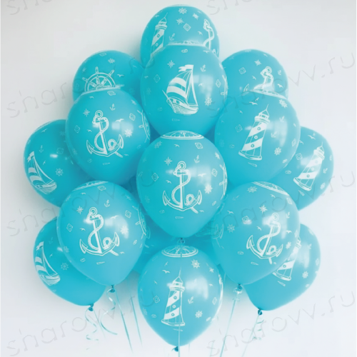 Облако из шаров "Морской фэшн" состоит из 20 латексных шариков с готовым дизайном. Размер латексных шаров 35-40см. Гарантированное время полета шариков 48 часов (как правило летают неделю и дольше). Шарики доставляются собранными в облако, которое можно распустить. Часть шариков можно собрать в фонтан, если это необходимо, укажите о необходимости внести изменения в заказ в комментарии или по телефону менеджеру.