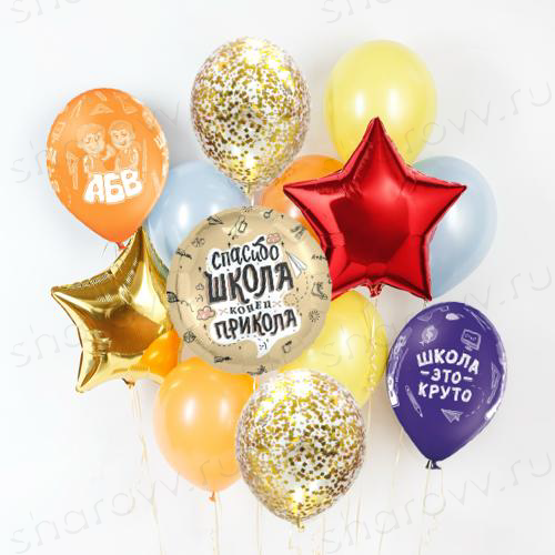 Букет из шаров для выпускников "Спасибо школа" состоит из 10 латексных (по 2 пастельного желтого, голубого и оранжевого цвета, 2 с конфетти и 2 шара ассорти с рисунком) и 3 фольгированных шариков: 2 звезды (красная и золотая), а также фольгированного круга с готовой надписью. Размер латексных шаров 35-40см. Гарантированное время полета шариков 48 часов (как правило летают неделю и дольше). Шарики доставляются собранные в букет который можно распустить. Цвет шариков с рисунком ассорти выбирает аэродизанер при создании композиции. Вы можете добавить количество шариков или попросить собрать их в фонтан - для этого сообщите о необходимости внести изменения в комментарии при оформлении заказа или менеджеру по телефону.