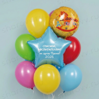 Фонтан из шаров "От всей души благодарим!" состоит из 11 латексных шариков пастель ассорти, фольгированной звезды голубого цвета с индивидуальной надписью и фольгированного шара круга с готовой надписью на выпускной в детском саду. Размер латексных шаров 35-40см. Гарантированное время полета шариков 48 часов (как правило летают неделю и дольше). Шарики доставляются собранными в фонтан на грузике.
